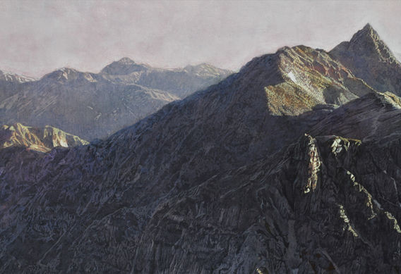 絵の画題は、初夏に北穂高岳の山頂から見た北アルプスの光景になります。