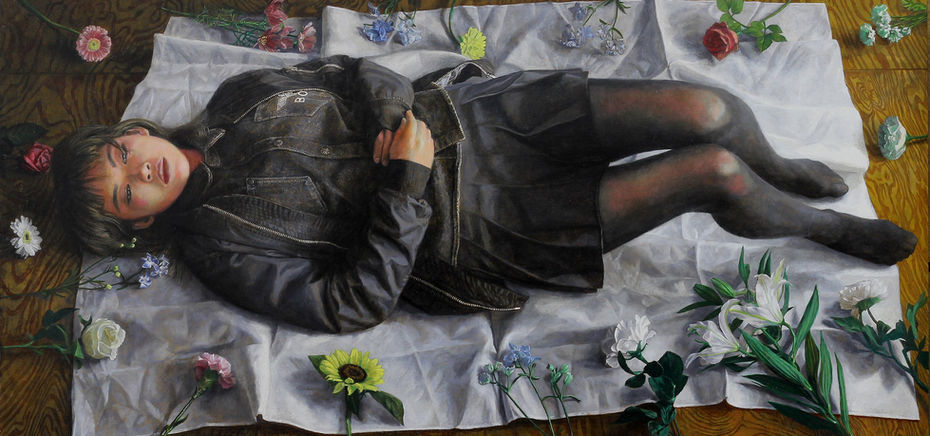 この作品は木のパネルに綿布を張り、下地材を塗った上に、油絵の古典技(グリザイユ)で描いています。